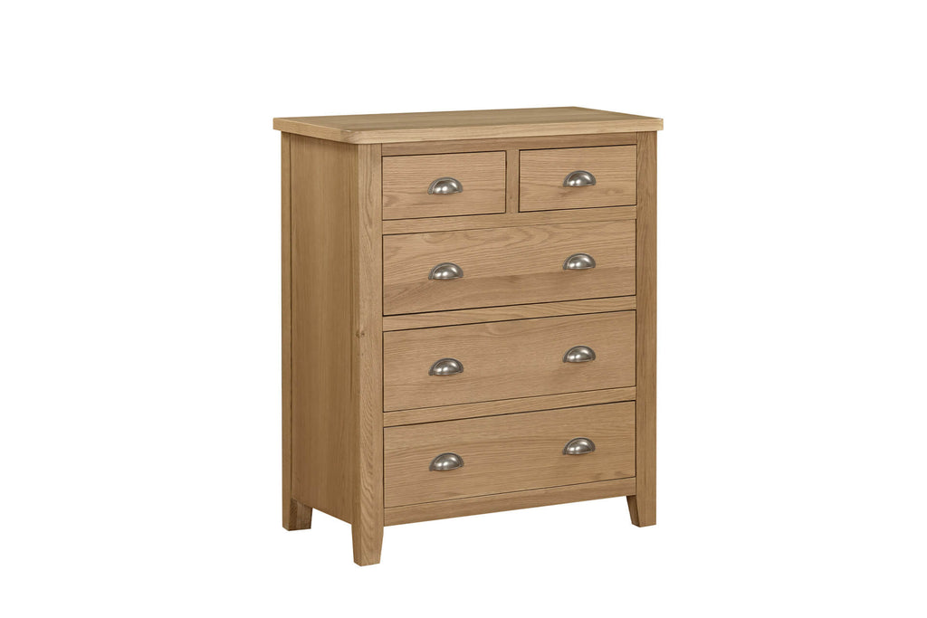 Marsden 5 Drawer Tall Chest in Natural Oak brings country chic style to bedroom spaces. Crafted with an Oak and Oak Veneer finish that highlights the natural warmth and grain of the wood. Designed with five drawers on traditional wooden runners and finished with classic cup handles, this chest offers practical storage and timeless charm. Ideal for adding character and functionality.