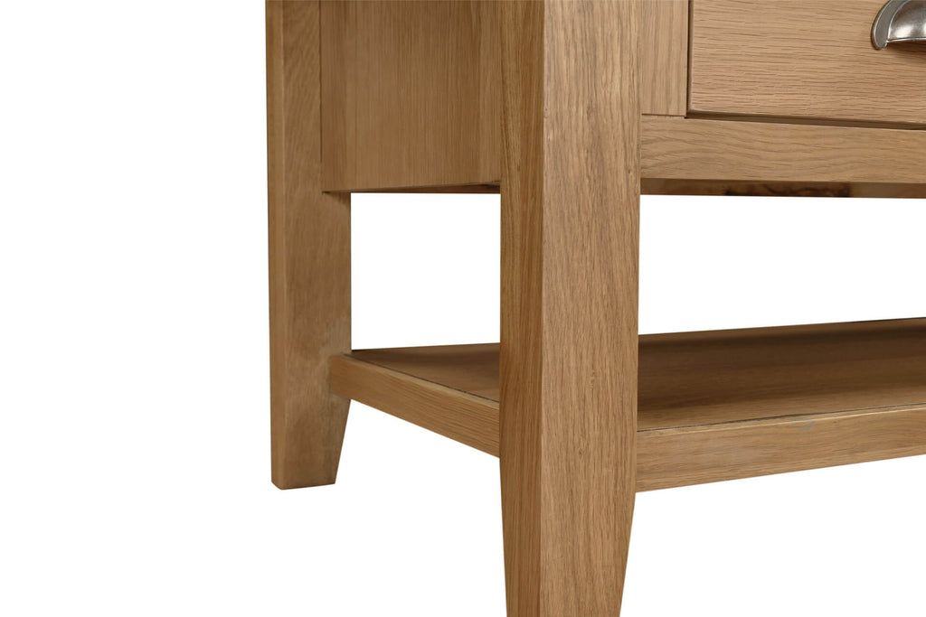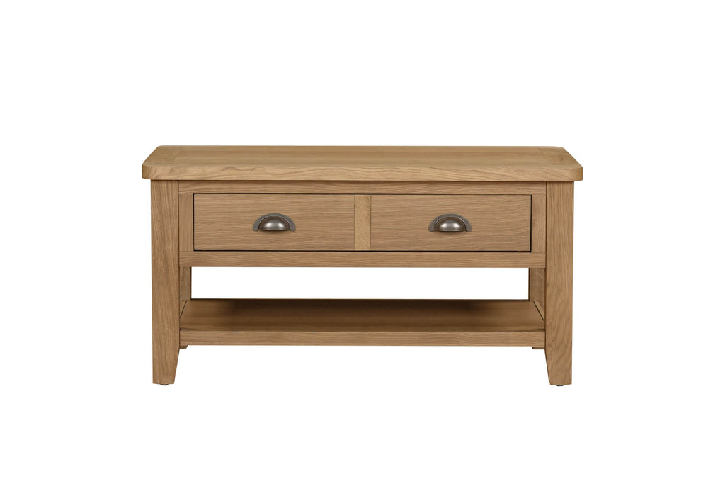 Marsden Coffee Table 900 in Natural Oak combines country chic style with smart functionality. Crafted with an Oak and Oak Veneer finish that highlights the natural beauty of the wood. A clever matchbox drawer opens from both sides with the help of traditional wooden runners and is finished with classic cup handles, offering practical and accessible storage. Its warm tones and timeless design make it a charming and versatile centrepiece for any living space.