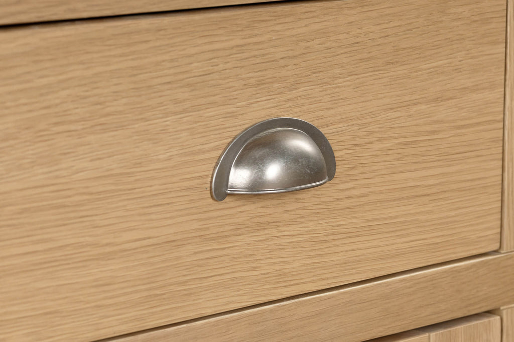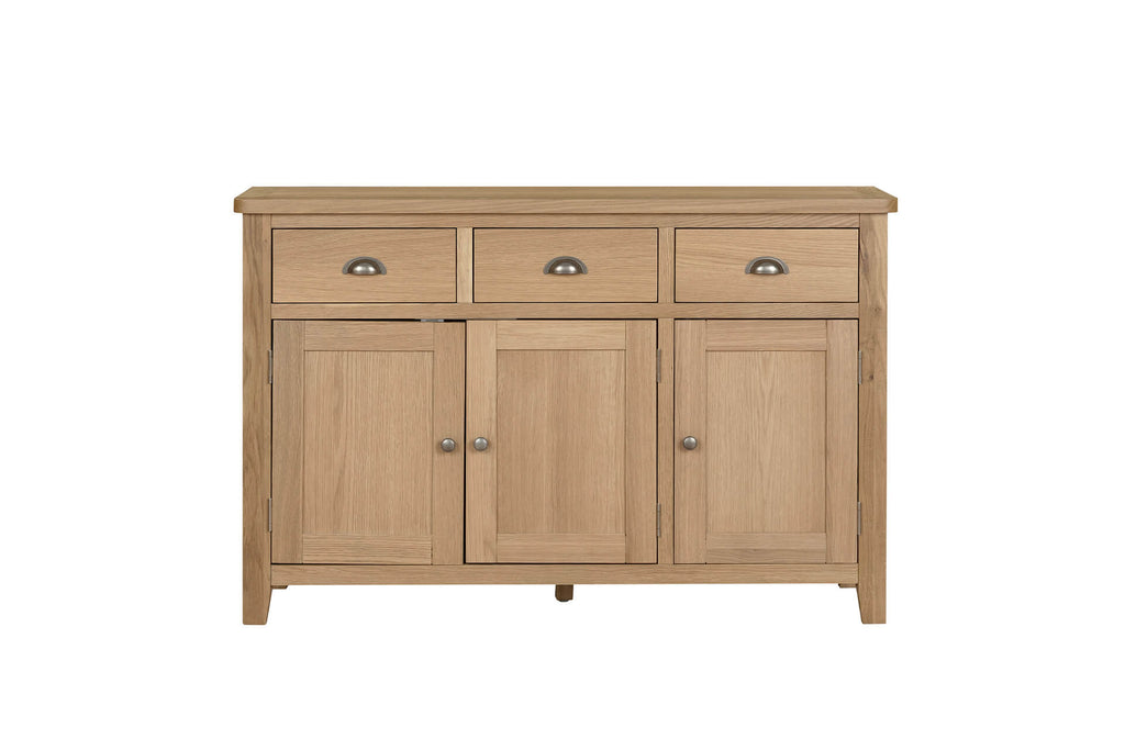 Marsden Large Sideboard in Natural Oak blends country chic style with practical functionality. Crafted with an Oak and Oak Veneer finish, it showcases the natural grain and warmth of the wood. Offering ample storage space, it includes adjustable shelves for flexible organisation and drawers set on traditional wooden runners. Finished with classic cup handles, this sideboard combines timeless charm with thoughtful design, perfect for enhancing both traditional interiors.