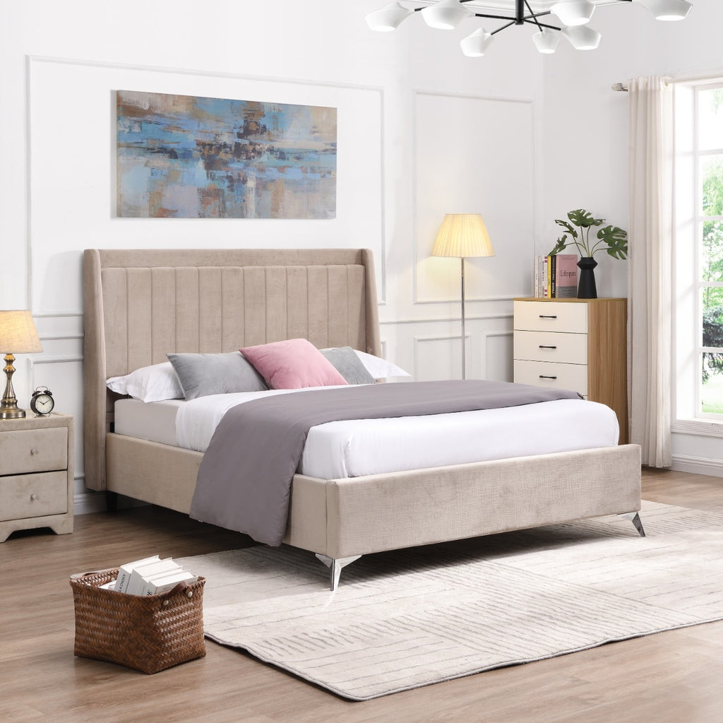 The Mayo bed is a must have, it is the perfect combination of style and timeless simplicity. The tidy low footend allows for optimal space to be used in a room. The stylish chrome feet have been designed to be a feature creating a clear modern look to this bed. The slightly winged headboard has been coupled with a luxury panelled design to create a comfortable backing as well as an aesthetically pleasing look. Available in the bestselling colours, Grey and Beige, this beautiful bed is offered in 4ft 6 and 5ft.