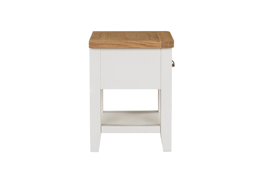 Mellor Lamp Table with 1 Drawer in Cashmere brings country chic style to compact living spaces. Featuring an oak-veneered grey wash top and a soft cashmere painted finish, it offers a timeless look with practical functionality. The drawer is set on traditional wooden runners and finished with a classic metal cup handle, making it ideal for keeping essentials close at hand while adding a touch of rustic elegance to your home.