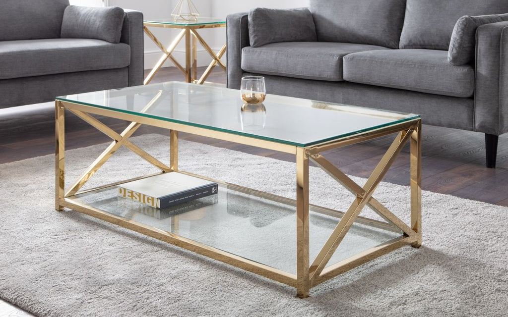 Miami Coffee Table – Gold with Tempered Glass and Art Deco Cross Frame Design