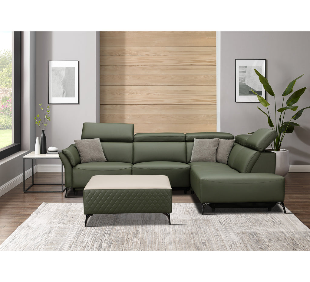 Introducing the Milan, a stunning corner suite that is the epitome of luxury. Presented in a striking forest green leather, this is the perfect sofa for friends and family or a relaxing stretch out on your own. The recliner is controlled by built in buttons on the wonderfully embossed chequered side. Also included are a set of cushions, adjustable headrests and a USB charging port.