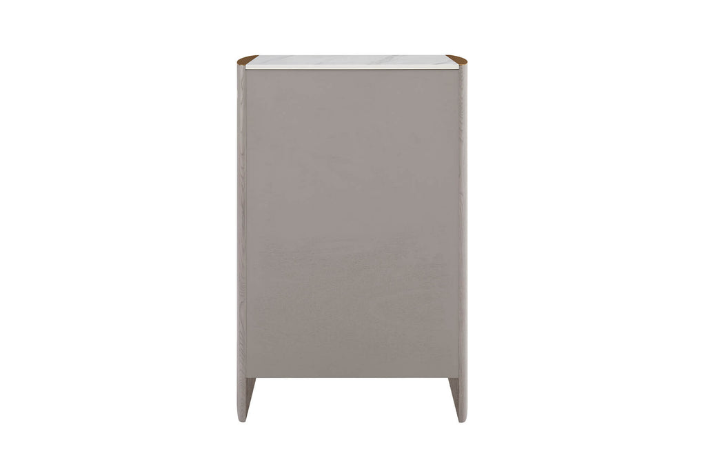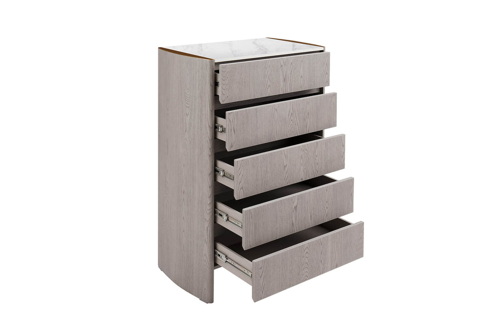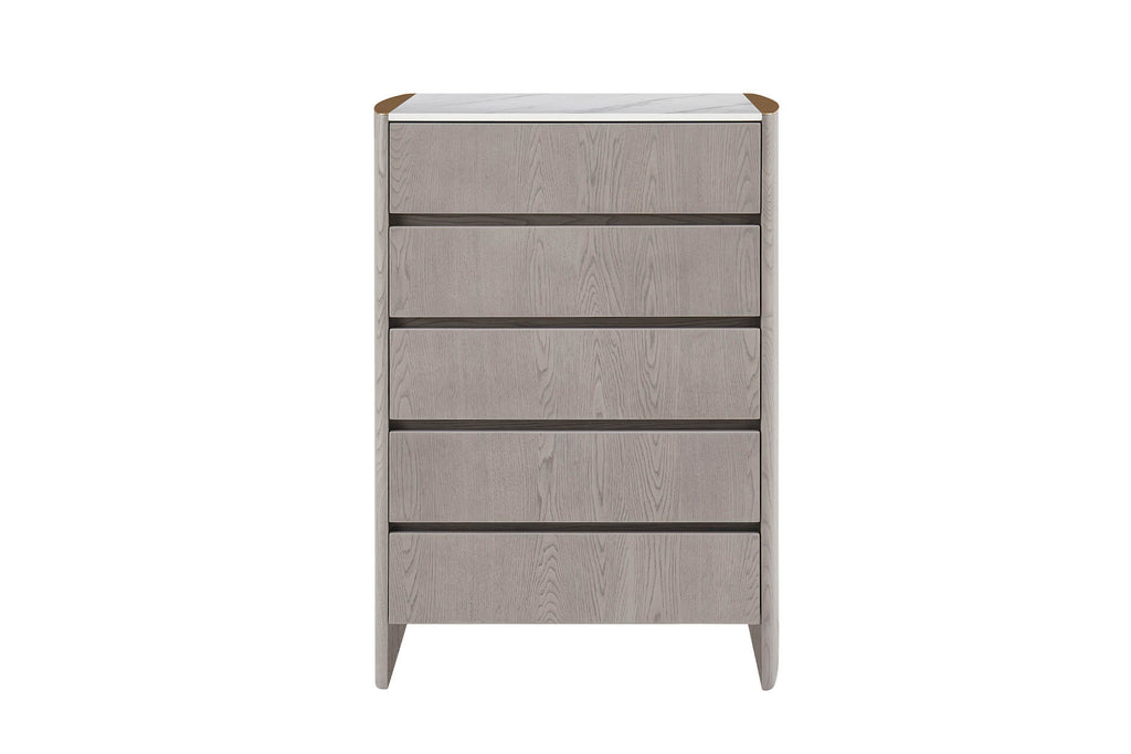 Mondello 5 Drawer Tall Chest in Washed Oak blends elegant design with everyday functionality. Featuring a durable elm veneer and a stainproof, antibacterial, scratch-resistant and waterproof sintered stone top edged in brushed stainless steel, it offers five spacious drawers for organised storage. With its luxurious finish and easy-to-clean surfaces, it's a sophisticated and practical choice for modern bedrooms.