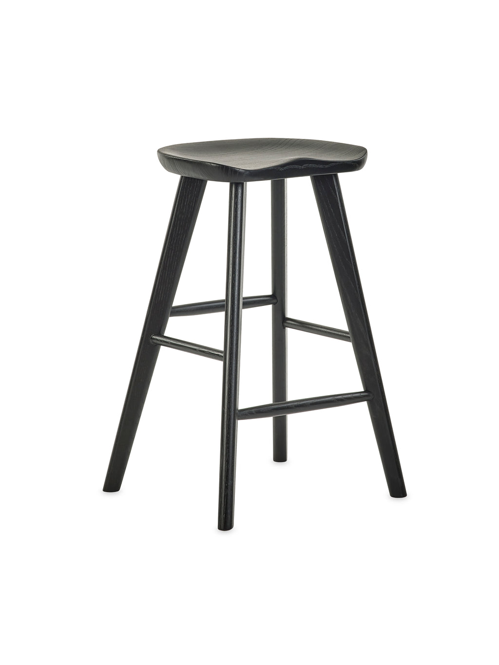 This timeless black bar stool combines practical style with everyday comfort, making it a smart choice for kitchen islands, breakfast bars, or casual seating areas. Finished in a classic matte black, the gently curved saddle seat features a subtle contour for ergonomic support, while the splayed legs and built-in footrest provide added stability. Compact and easy to assemble, with all legs included.