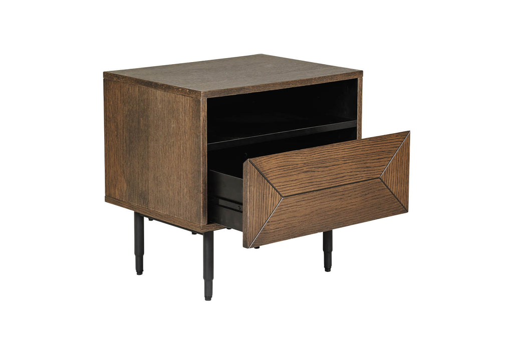 The Nate Bedside Table in Brown or Natural Oak adds a contemporary touch to any bedroom. Crafted from engineered wood with a sleek natural oak or brown finish, it features eye-catching geometric patterns that enhance its modern appeal. Elevated on black powder-coated metal legs, this bedside table offers a stylish industrial contrast. A single drawer provides hidden storage, while an open shelving unit with a painted finish adds extra functionality.
