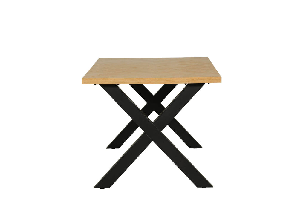 Nate Dining Table 1400 in Natural Oak offers a contemporary design. Crafted from engineered wood with a natural oak finish, it features geometric patterns that lend a distinctive, stylish touch to your dining area. The table is supported by sleek black powder-coated metal legs, adding a sophisticated contrast and ensuring durability. Its clean lines and geometric detailing make it a striking centrepiece, perfect for modern dining spaces.