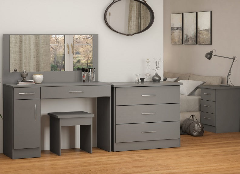 The Nevada Full Grey Three Drawer Chest is a grey wood board furniture item with metal hinges, drawer runners & handles, suitable for all bedroom decors. This item is part of our Nevada Bedroom Collections, these ranges are also available in a grey & oak, white & oak or oyster & oak finishes.