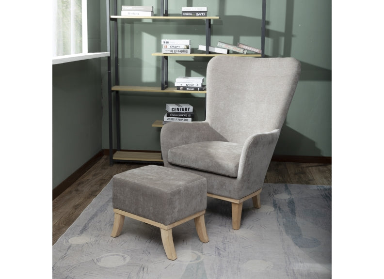The Grey Fabric 1986 Chairs with colour matched footstool, super soft plush fabric upholstery and high back.