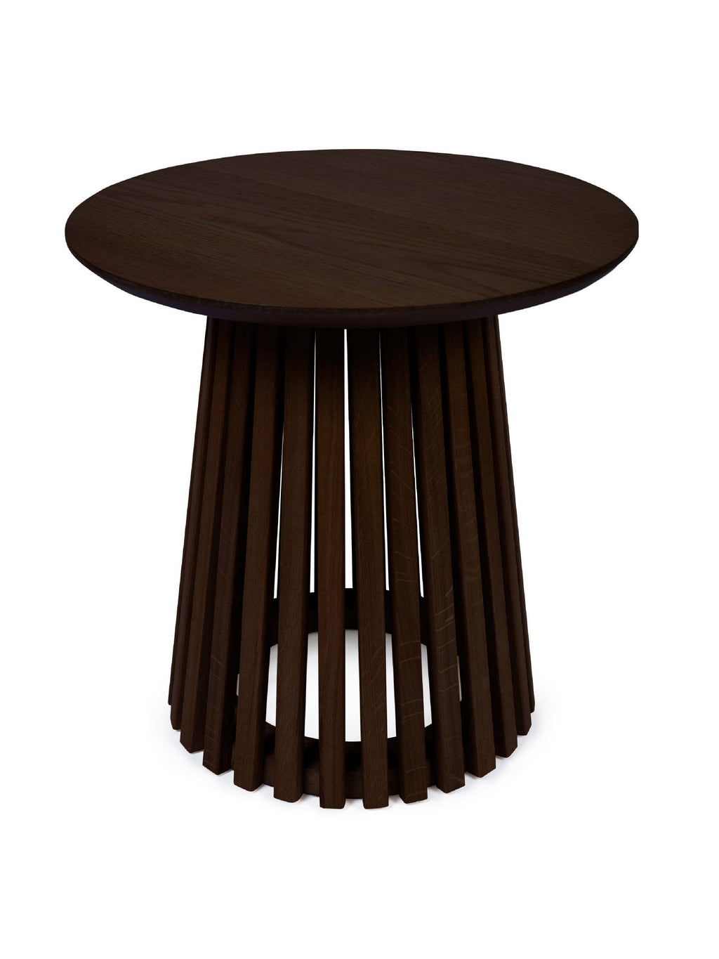 Add a touch of warmth and texture to your space with this round lamp table. Finished in dark oak, the smooth top highlights the rich wood grain and warm tone. Its bold slatted base brings subtle architectural detail while keeping the design light and open. Compact and versatile, it's ideal beside a sofa, bed or reading chair.
