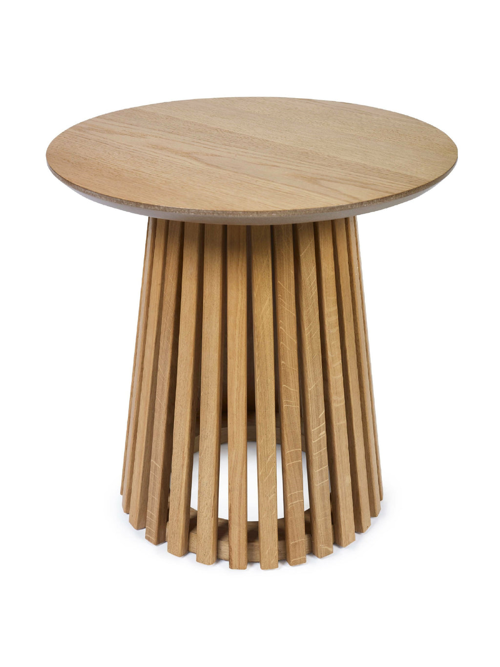 Enhance your space with warmth and modern charm through this round slatted lamp table. Finished in natural oak, the smooth wood-grain top is ideal for holding a lamp, plant, or a stack of books, while the airy cylindrical slatted base adds subtle detail and structure. Compact in size yet full of style, it’s perfect as a side table in the living room or a bedside table in more relaxed, modern interiors. Partial base assembly required.