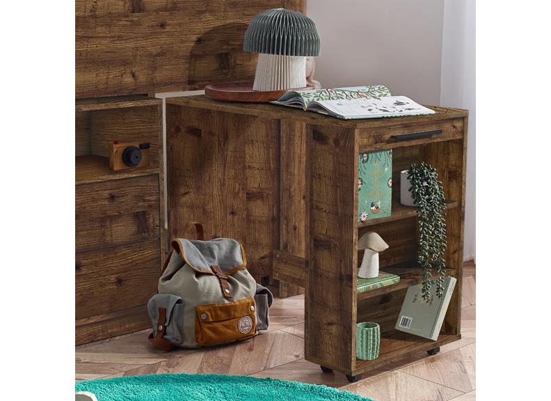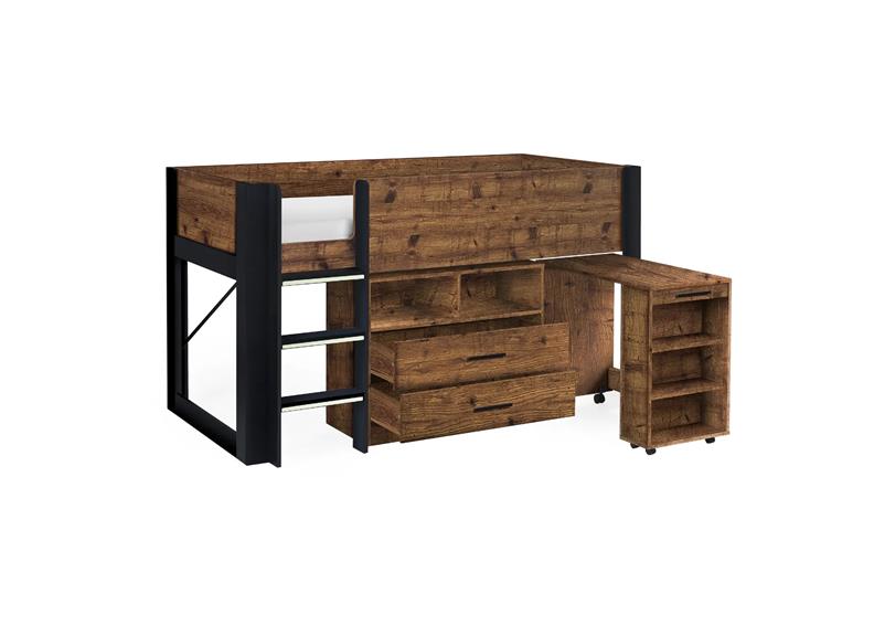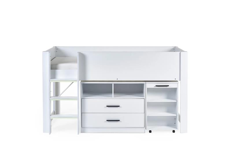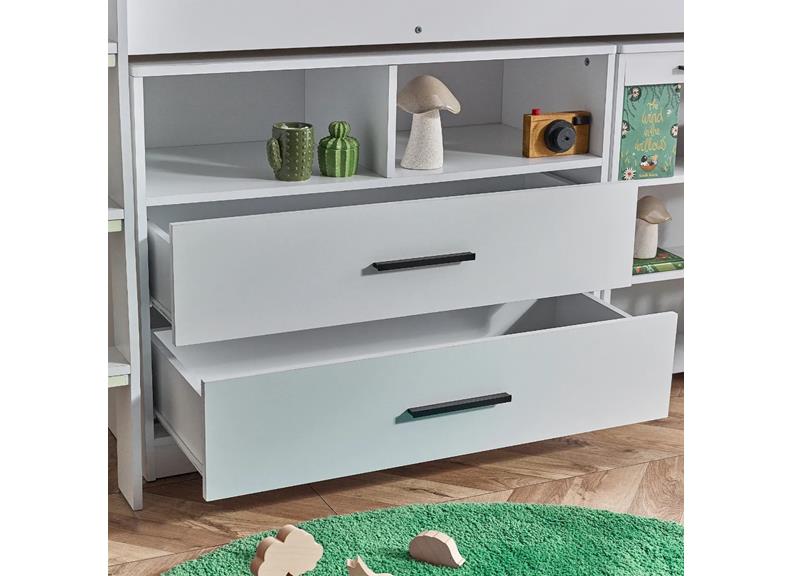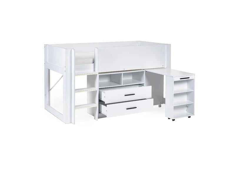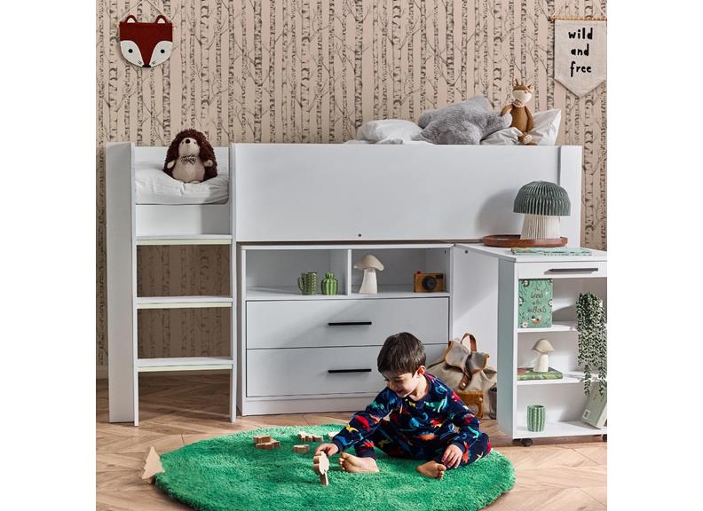 A versatile and stylish addition to any childs bedroom that will transform bedtime tantrums into a playful adventure. This sleeper comes with drawers, shelving and a useful pull-out desk on wheels and is complete with glow-in-the-dark steps on the ascent ladder.