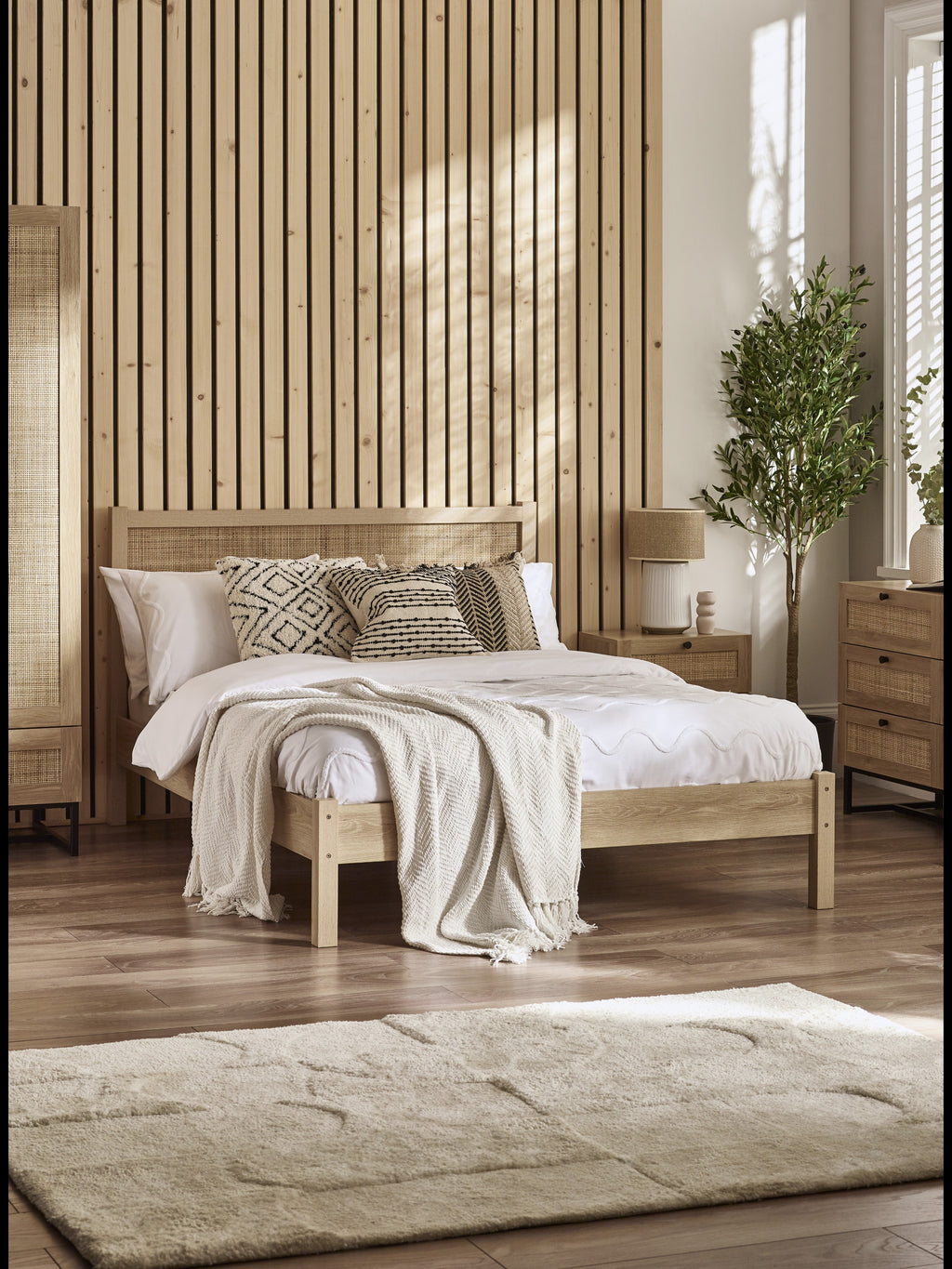 Transform your bedroom into a haven of style with the Padstow Rattan Bed in Oak. This exquisite bed features an ornate weaved rattan headboard that brings a hint of retro charm and modern elegance to your space. The bohemian-inspired design seamlessly blends timeless aesthetics with contemporary flair, while the sturdy construction ensures reliable support for a restful night's sleep. The rich oak finish adds warmth and character, creating a cosy yet sophisticated ambiance that enhances any room. Mattress sold separately.