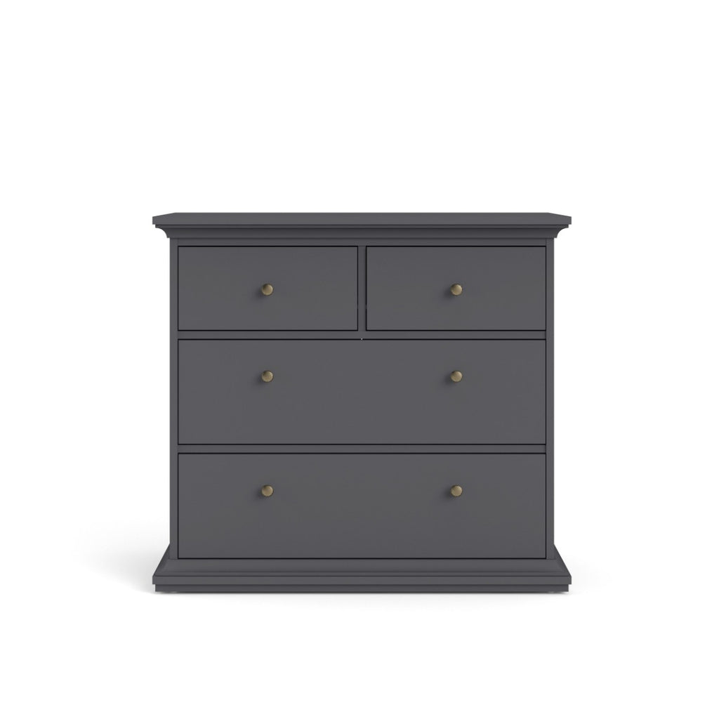 The Paris 4 Drawer Chest, with dimensions of 96.2 x 48.5 x 86.9 cm (Width x Depth x Height), offers a compact yet impactful solution for organizing your belongings. The trendy matt grey finish enhances the overall aesthetic, creating a piece that effortlessly blends with various interior styles. The chest features four spacious drawers, providing ample storage space for your essentials.