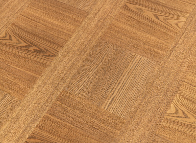 An extending dining table with an oak finish, a centre leaf extension mechanism, an inlaid parquet design and supported by a black metal X frame. Included here with our Maisy Teal PU Leather Chairs/Bench to complete a dining set.