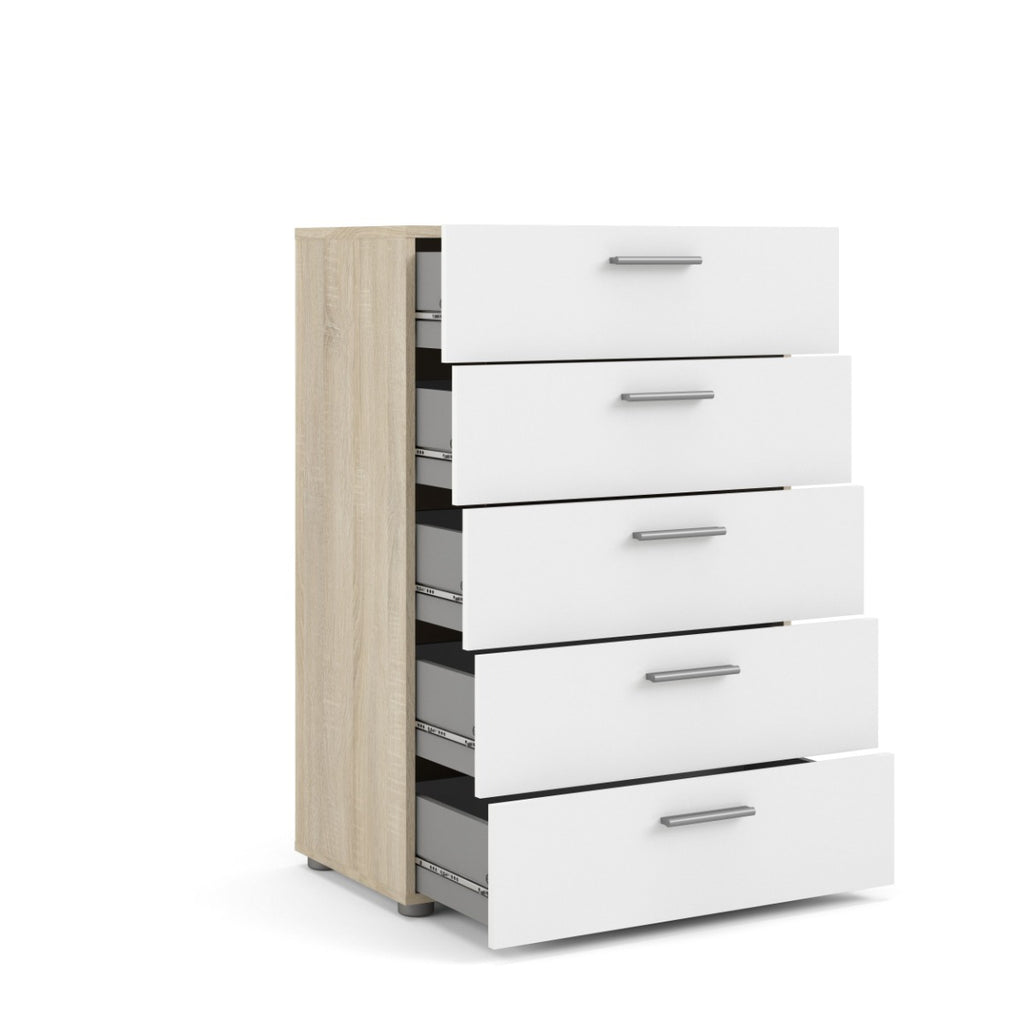 Upgrade your bedroom storage with the Pepe 5 Drawer Chest, a stunning addition to the Homeline Furniture collection. This stylish and practical chest is meticulously crafted to bring a modern and elegant touch to your space, featuring a sleek combination of oak with high-gloss white accents and contemporary metal handles.