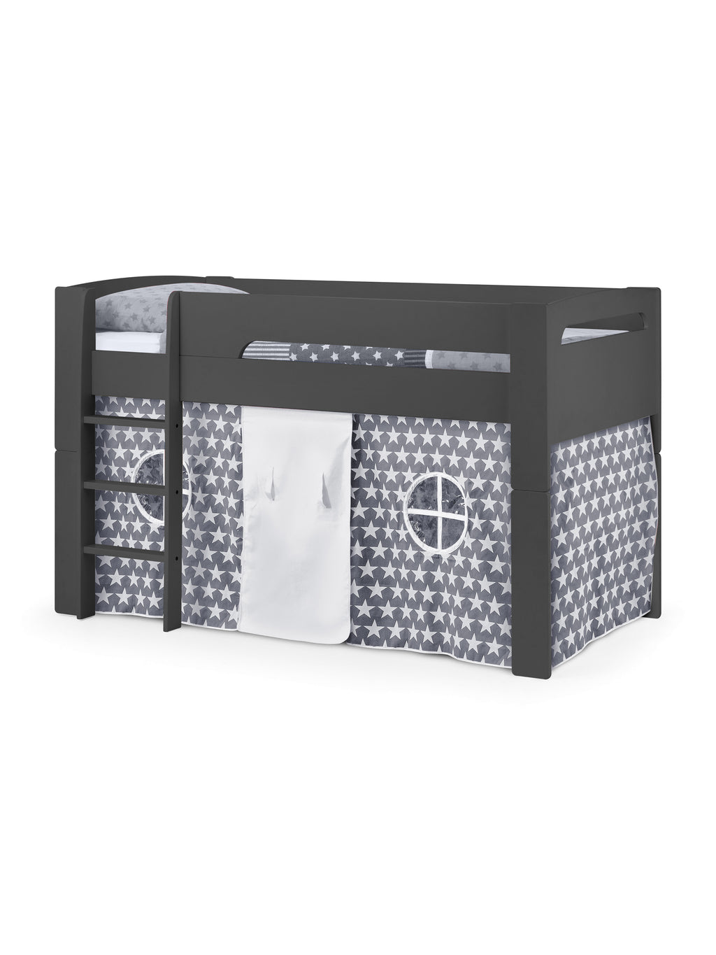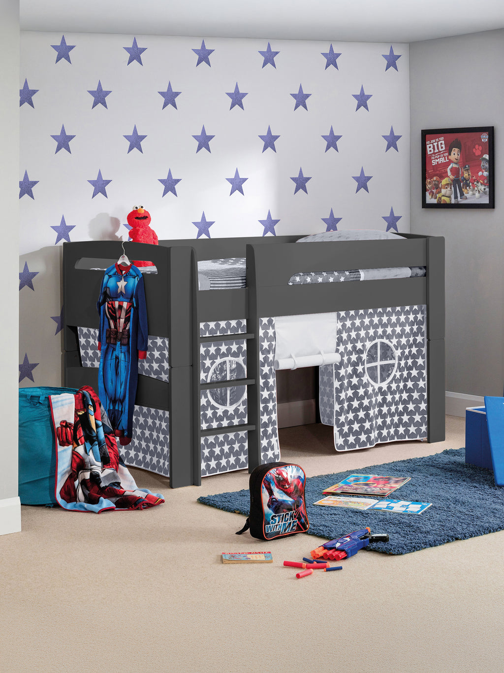 Create a bold and modern look with this midsleeper in anthracite, paired with the grey star tent. The deep grey finish adds a stylish edge, while the strong wooden frame ensures long-lasting support. Designed with flexibility in mind, the ladder can be fixed to either side, and the frame easily converts into a single bed when needed. The matching grey star tent turns the space underneath into an exciting hideout, offering the perfect spot for games, books, or a cosy retreat. With its playful roll-up door and peek-through windows, it brings fun and character while keeping the space inviting. Easy to attach and remove, it’s a simple way to add a touch of adventure to everyday routines. No assembly required for the tent. Bed requires self assembly. Mattress sold separately.