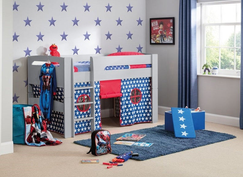 The Pluto Mid-Sleeper in pale dove grey has a stylish contemporary design. The sturdy access ladder may be placed on left or right depending on assembly preference and can be converted to a single bed if desired.