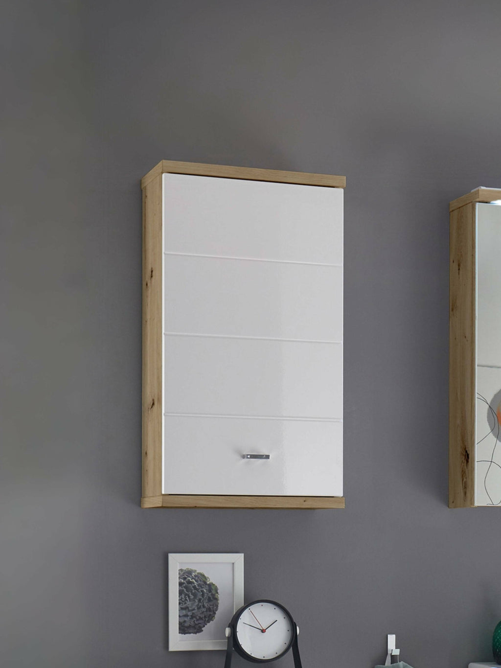 The Pool Wall Unit brings a sleek, space-saving solution to your bathroom with its Artisan Oak build and glossy white front featuring a lined notch design. This wall-mounted cupboard has two spacious shelves behind its door, offering generous storage to keep your bathroom tidy and organised. The silver handle adds a refined touch to its modern design. Whether you're storing toiletries or essentials.
