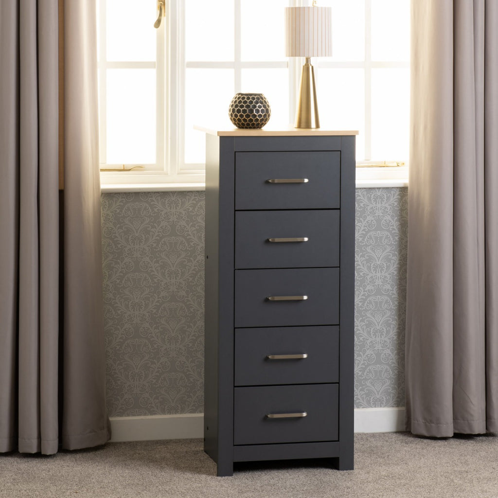 Introducing the Portland 5 Drawer Narrow Chest in Grey/Oak Effect, a sleek and practical storage solution for your bedroom: