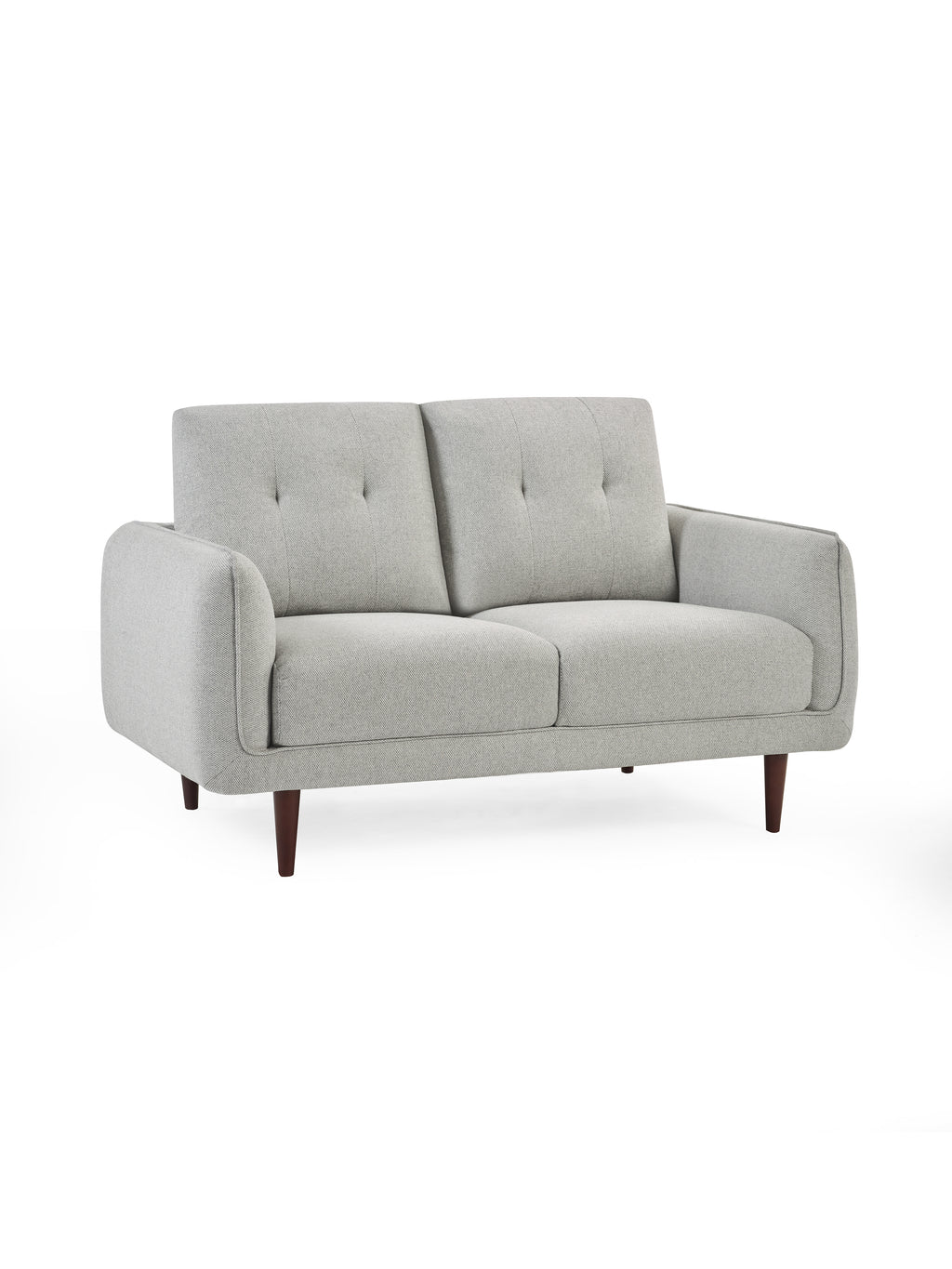 Compact and stylish, this light grey two-seater sofa combines mid-century design with modern comfort. Upholstered in a soft, durable woven fabric, it features clean lines, tufted back cushions, and tapered walnut wooden legs for a sleek, retro-inspired look. Perfect for smaller spaces or as additional seating, this seater sofa offers a cosy spot to relax without overwhelming your room. Assembly required.