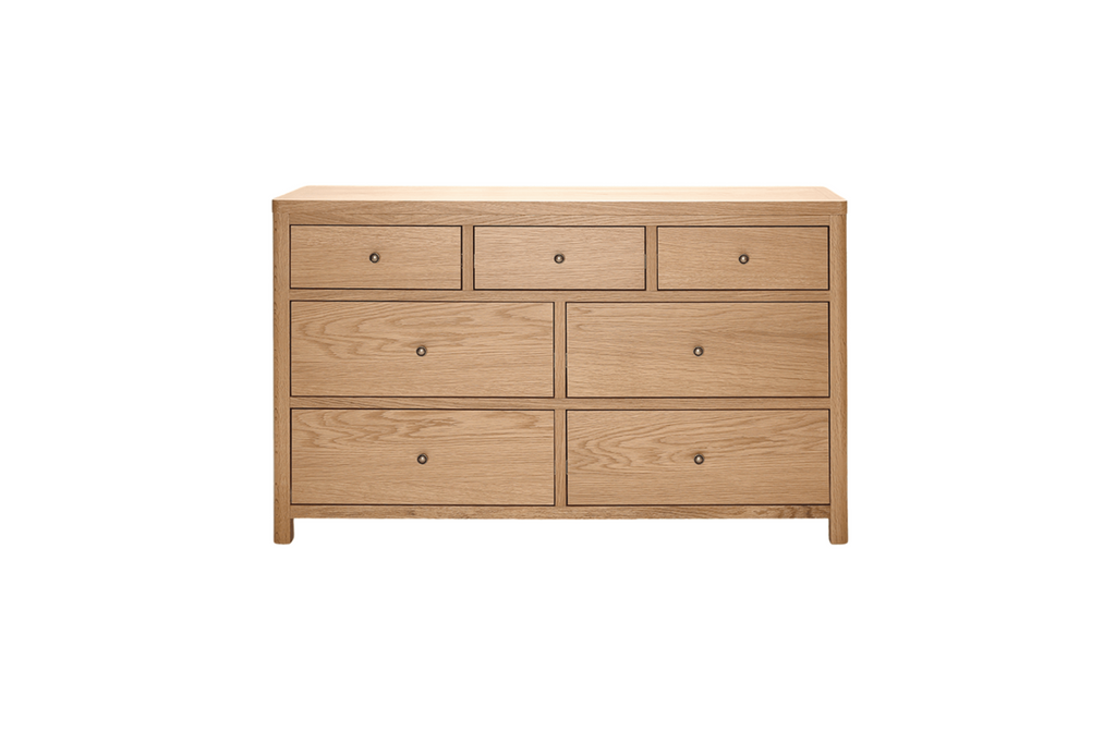The Renata 7 Drawer Dresser Chest in Oak is a blend of style and functionality. Crafted from solid oak and oak veneer, its smooth rounded edges and flush sides and tops offer a clean, modern look. With brushed metal handles and smooth runners on drawers, it's both elegant and practical.