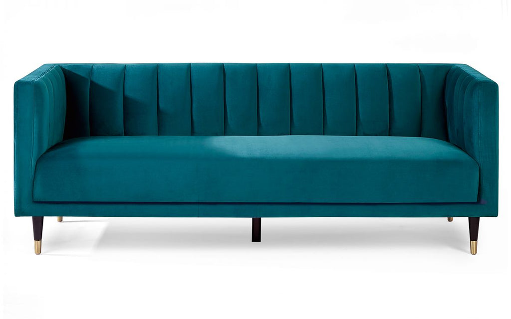 Elevate your living space with the Salma Scalloped Back 3+2+1 Seat Sofas in Teal, featuring fluted back velvet upholstery and brass-tipped legs. This striking, modern sofa group brings both comfort and style to your home, making it the perfect centerpiece for any room.