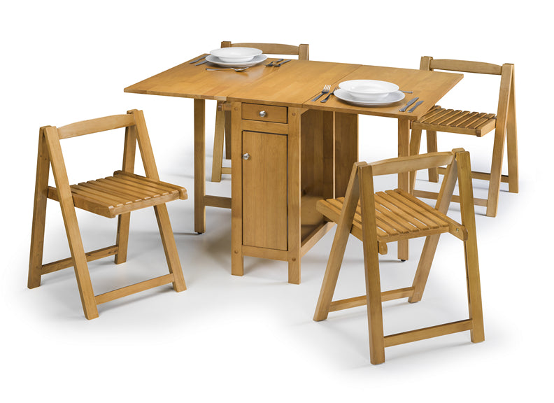 The Savoy Dining Set is a functional & neat looking dining set where the four chairs when not in use can be folded and placed inside the table.