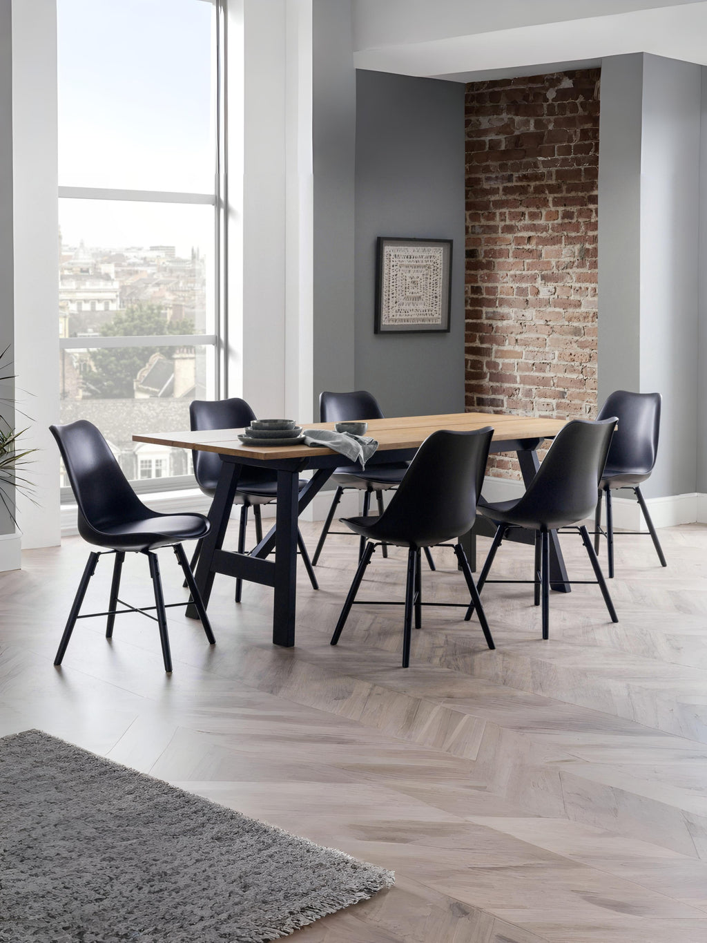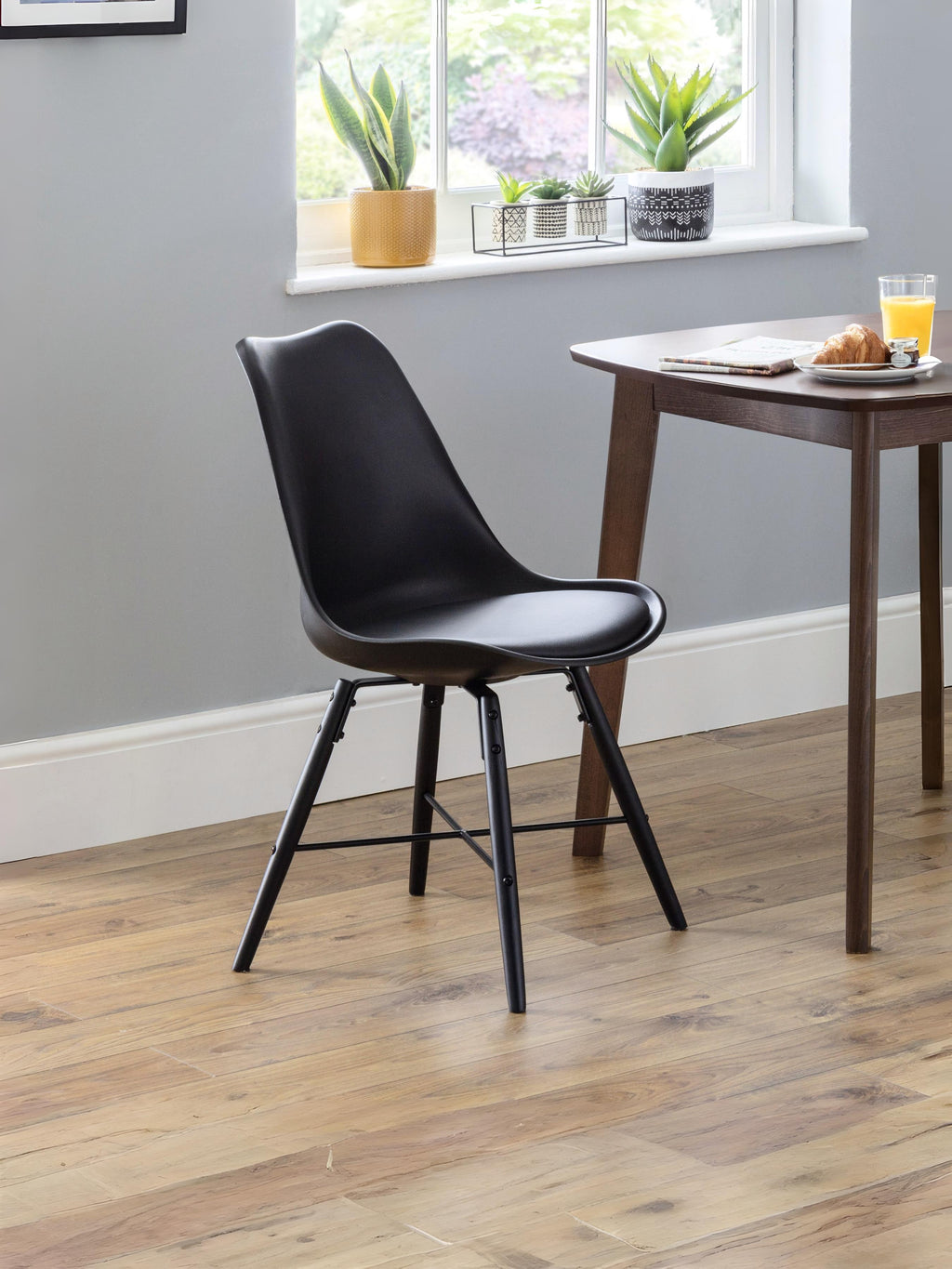 The Kari Dining Chair features a curved design that conforms to the natural curve of the spine, paired with a high-quality padded seat allowing you to reach maximum comfort. Featuring a black, easily-cleaned seat and black legs, with an steel cross bar giving this chair a modern industrial feel. Available in three colour options.