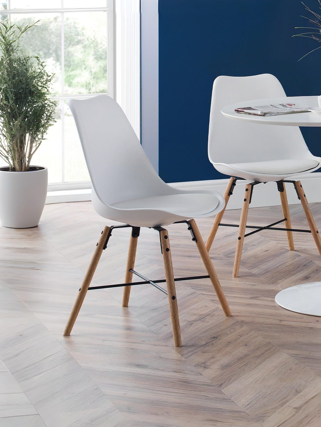 The Kari Dining Chair features a curved design that conforms to the natural curve of the spine, paired with a high-quality padded seat allowing you to reach maximum comfort. Featuring a white, easily-cleaned seat and oak effect legs, with an steel cross bar giving this chair a modern industrial feel. Available in three colour options.