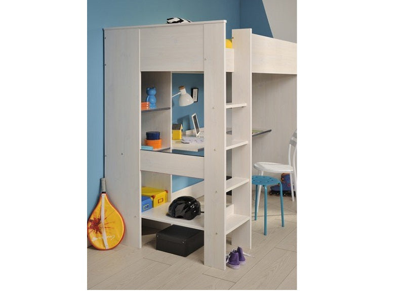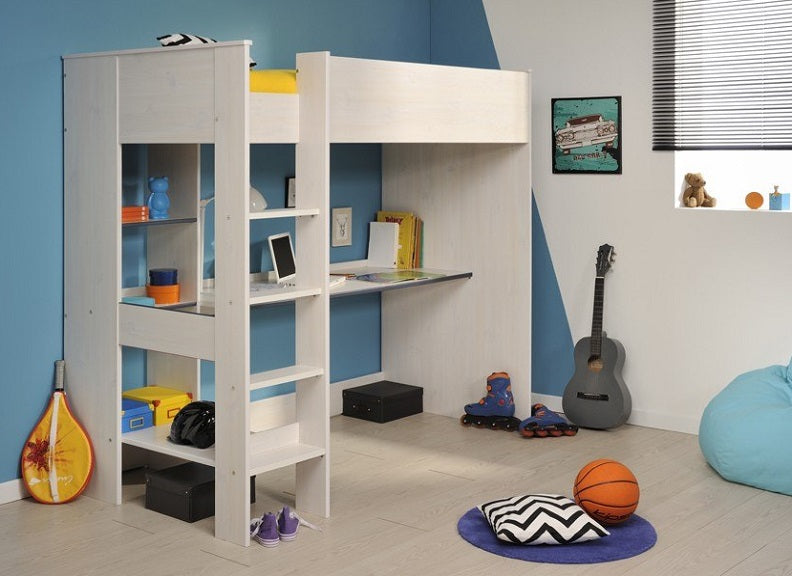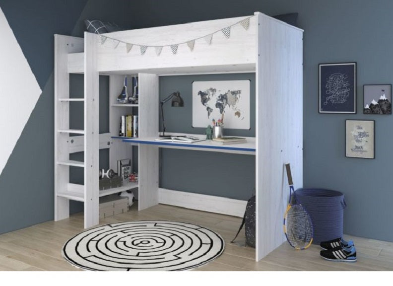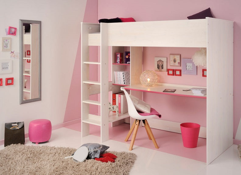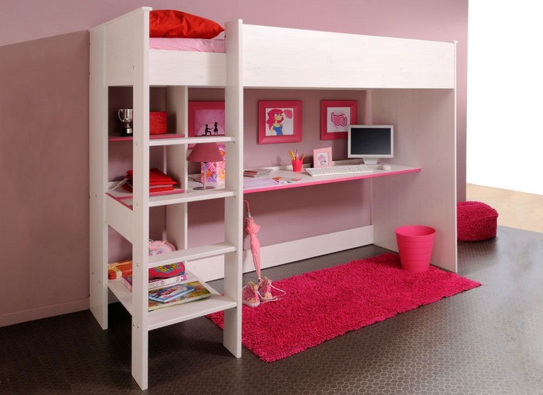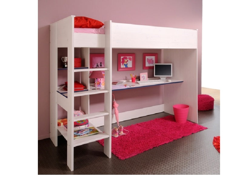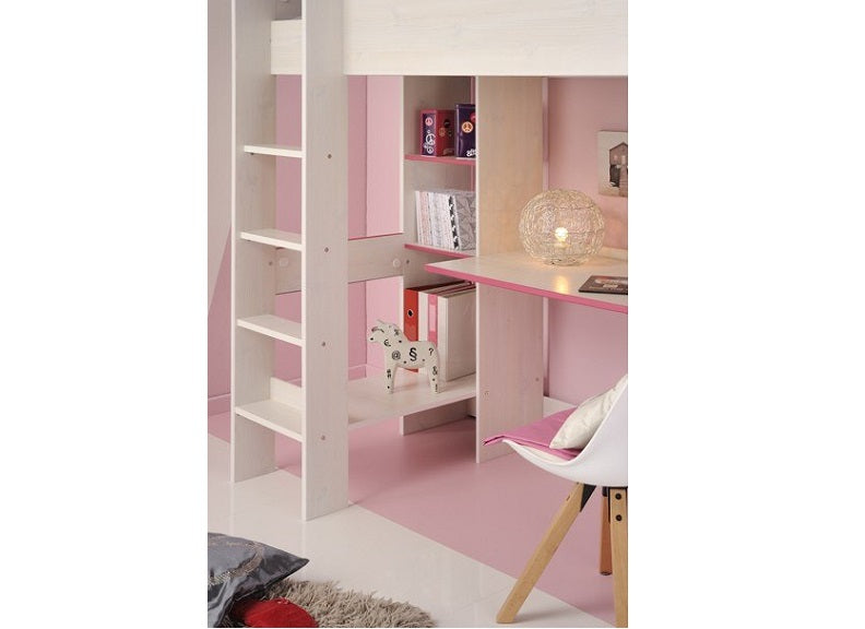 Smoozy White High Sleeper in a blue or pink trim with integrated desk & shelving.