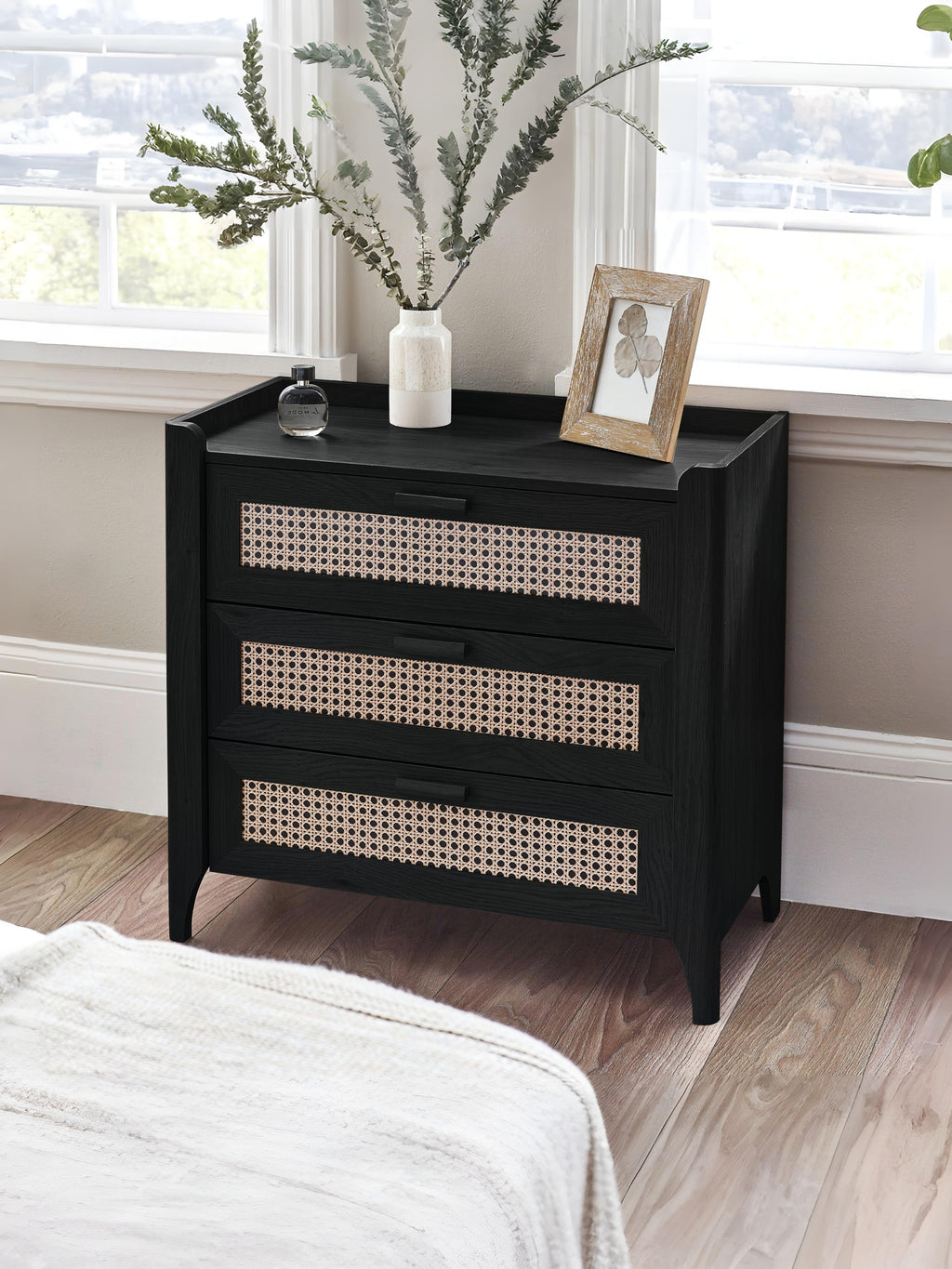 The Sydney 3 Drawer Chest in Black Ash combines sleek bohemian design with practicality. The smooth curved edges and raised lip offer both style and function, while the rattan print sticker front creates a clean, dust-free design with no gaps or holes. This chest features three spacious drawers with gloved handles for easy access, perfect for storing your essentials. Minimal assembly is required, providing a quick and easy setup to bring warmth and elegance to your home.