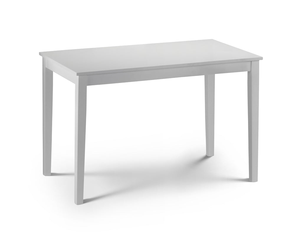 A rectangular fixed dining table composed of lacquered tropical hardwood and MDF, these are available in pale grey or white colours(view images)-select your desired option from menu.