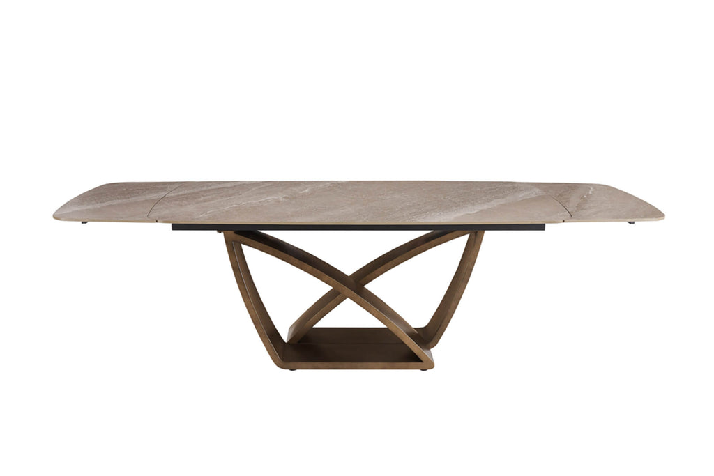 Vanosa Extending Dining Table in Brown offers a stylish and practical solution for any dining space. Featuring a durable sinter stone top that is water repellent, scratch-resistant, stainproof, and non-porous, this table ensures lasting quality and easy maintenance. With a robust metal frame and an extending mechanism, it provides versatility for both intimate dinners and larger gatherings.