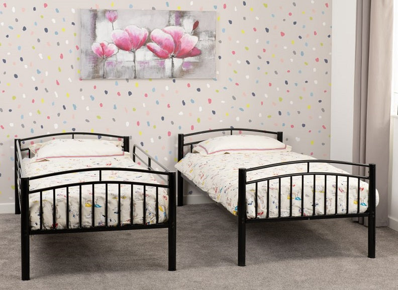 The Ventura Black Metal Bunk Bed - a metal bunk bed at a very attractive price. This bunk can be used as two single beds if desired-view images.