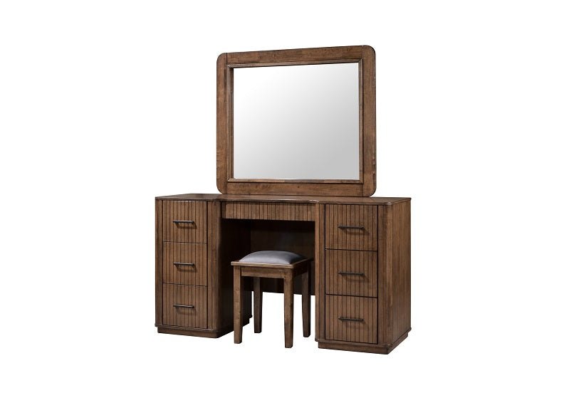 The gently curved edges of the Vienna set not only contribute to its aesthetic appeal but also reflect the thoughtful design that defines this piece. Included is an integrated mirror and a plush bedroom stool.