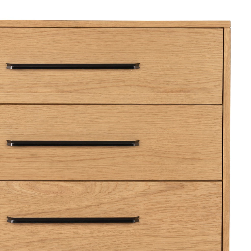 Elevate your bedroom with the Viento 4 Drawer Chest, a masterpiece from the Viento collection. The eye-catching starburst design, expertly crafted from Oak and Oak veneers, features hand-cut marquetry finished in natural Oak wax. The handle-less doors contribute to a seamless appearance, allowing the starburst to be a captivating focal point for any living space.