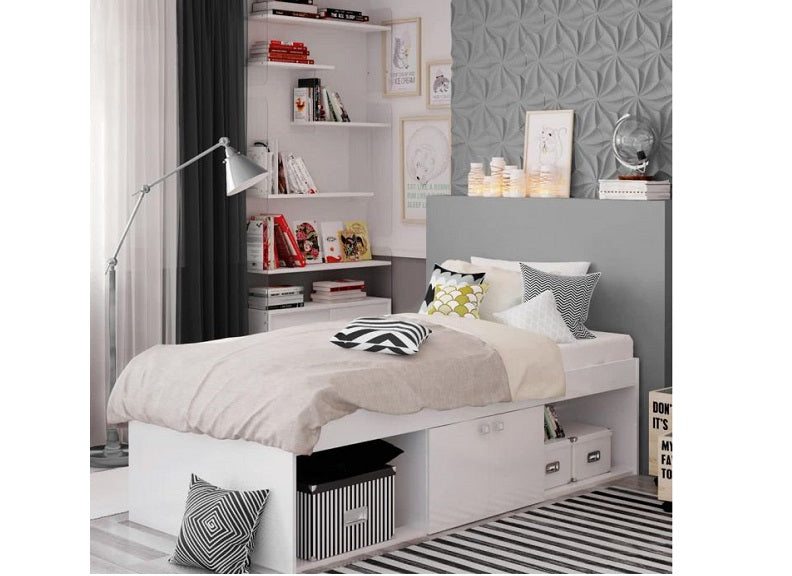 A white sleeper with 'easy clean' panels with low profile, rounded child friendly edges, a two door cupboard & small storage areas. Ideal bed for toys, books etc.